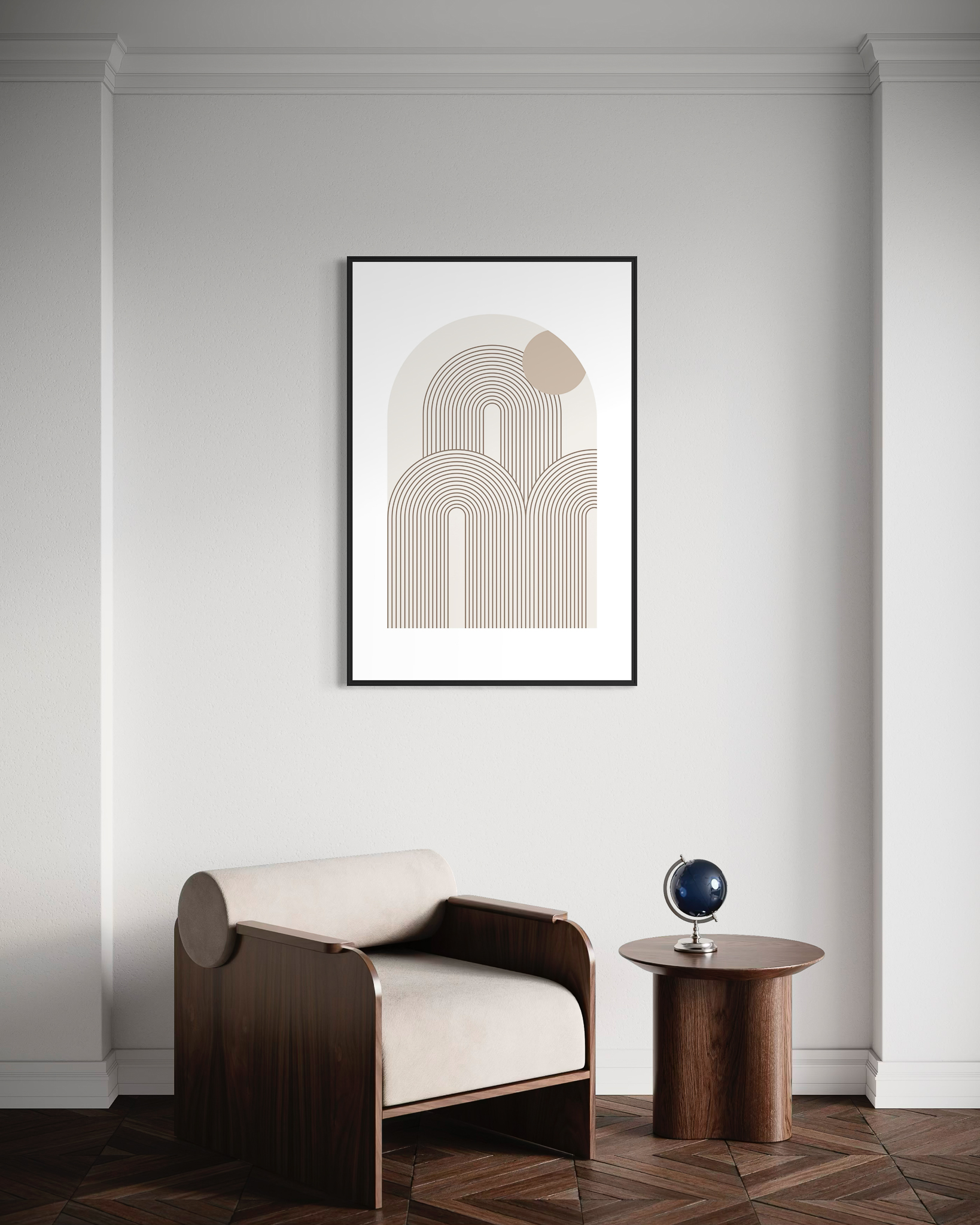 Kompozycja i spokojna kolorystyka dobrze grają z trendami Japandi, Scandi, loft i modern classic.